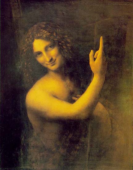 จากภาพนี้เราพบข้อสังเกตุคือ ท่าทางชี้นิ้ว อันเป็นท่าทางที่ลีโอนาร์โดชอบวาด และการชี้นิ้วขึ้นฟ้าคือการบ่งบอกนัยถึงสวรรค์ กล่าวคือการชี้เป็นการนำสายตานั่นเอง แต่ทว่าการชี้ทั้งหมดในภาพของเขากลับถูกบิดเบือนในนิยายเป็นการปาดคอไปหมด